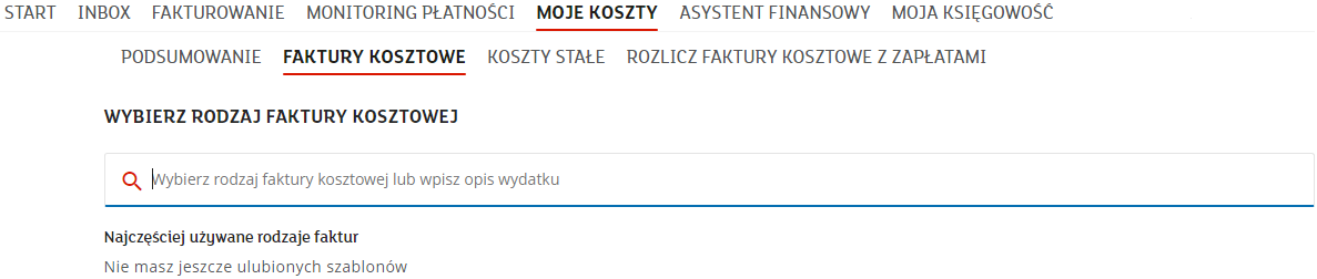 W tym celu po stronie kosztów należy przejść do zakładki Moje koszty/Faktury kosztowe, kliknąć przycisk Dodaj wydatek i wybrać jeden z szablonów kosztowych w zależności od transakcji jakiej dokument dotyczy.