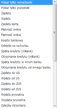 W zakładce Asystent finansowy po lewej stronie w Panelu filtrów znajduje się opcja Typ operacji. Po kliknięciu w nią rozwinął się poszczególne typy operacji bankowych.