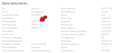 Okres księgowy oznacza miesiąc, w którym dokument zostanie ujęty w KPiR dokumentami. Domyślnie jest on podpowiadany przez system na podstawie wprowadzonych dat: wystawienia, sprzedaży oraz wpływu (dla wydatków).