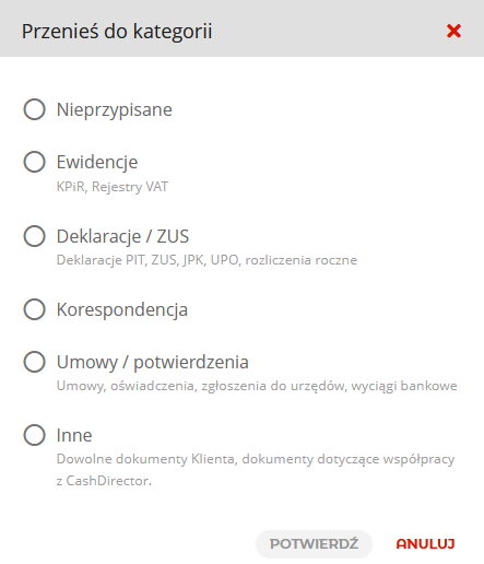 Po kliknięciu w akcję Przenieś wyświetli się dodatkowe okno z możliwością wyboru do jakiej kategorii mają zostać przeniesione zaznaczone dokumenty.