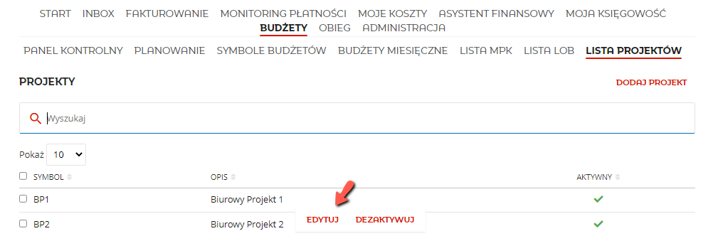 Wcześniej dodany projekt w zakładce Budżety/ lista projektów można edytować. Poprzez nakierowanie kursora myszki na konkretny projekt i wybranie przycisku Edytuj